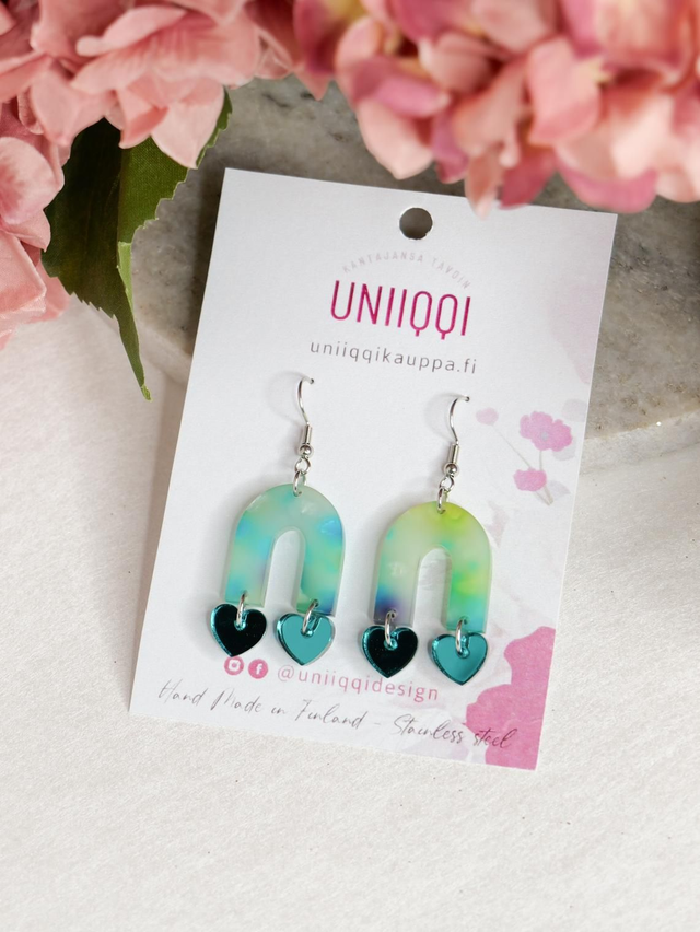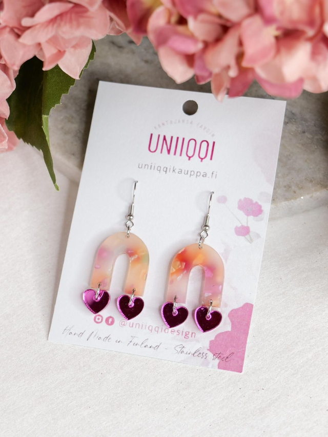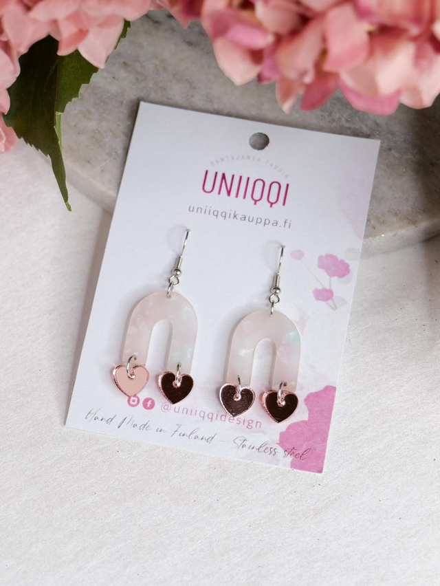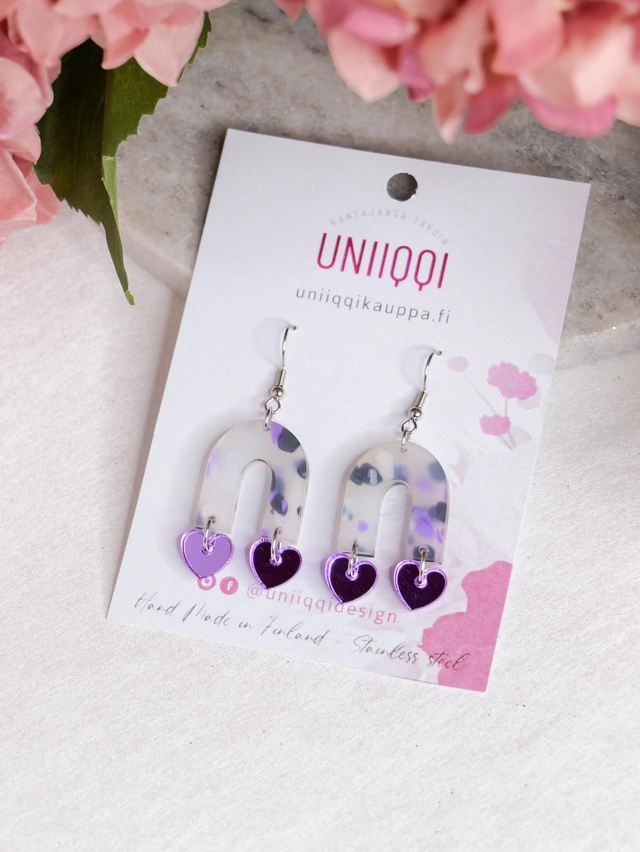 Romanttiset ja leikkisät Herttanen-korvakorut sulattavat sydämet! Näissä akryylisissa korvakoruissa kauniisti kaartuva kaari kantaa kahta säihkyvää peiliakryylista sydäntä, jotka tuovat ripauksen eleganssia ja iloa asuusi. Kevyet ja mukavat käyttää, ne sopivat niin arkeen kuin juhlaan – täydellinen valinta, kun haluat säihkyä tyylillä ja hurmata ympärilläsi olevat.