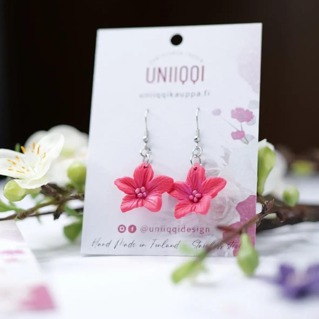 Kukkivaa väriä ja iloa päivääsi näillä ihanan kevyillä ja kauniilla kukka-korvakoruilla! Valitse suosikkisi värivalikoimastamme tai laita viestiä jos haluamaasi väriä ei löydy.