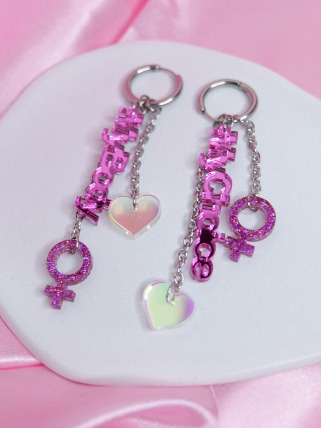 Kimaltava ♀-symboli ja hologrammiset sydämet tuovat koruihin upeaa säihkettä ja voimaa, ja kevyet akryyliosat tekevät niistä miellyttävät käyttää.